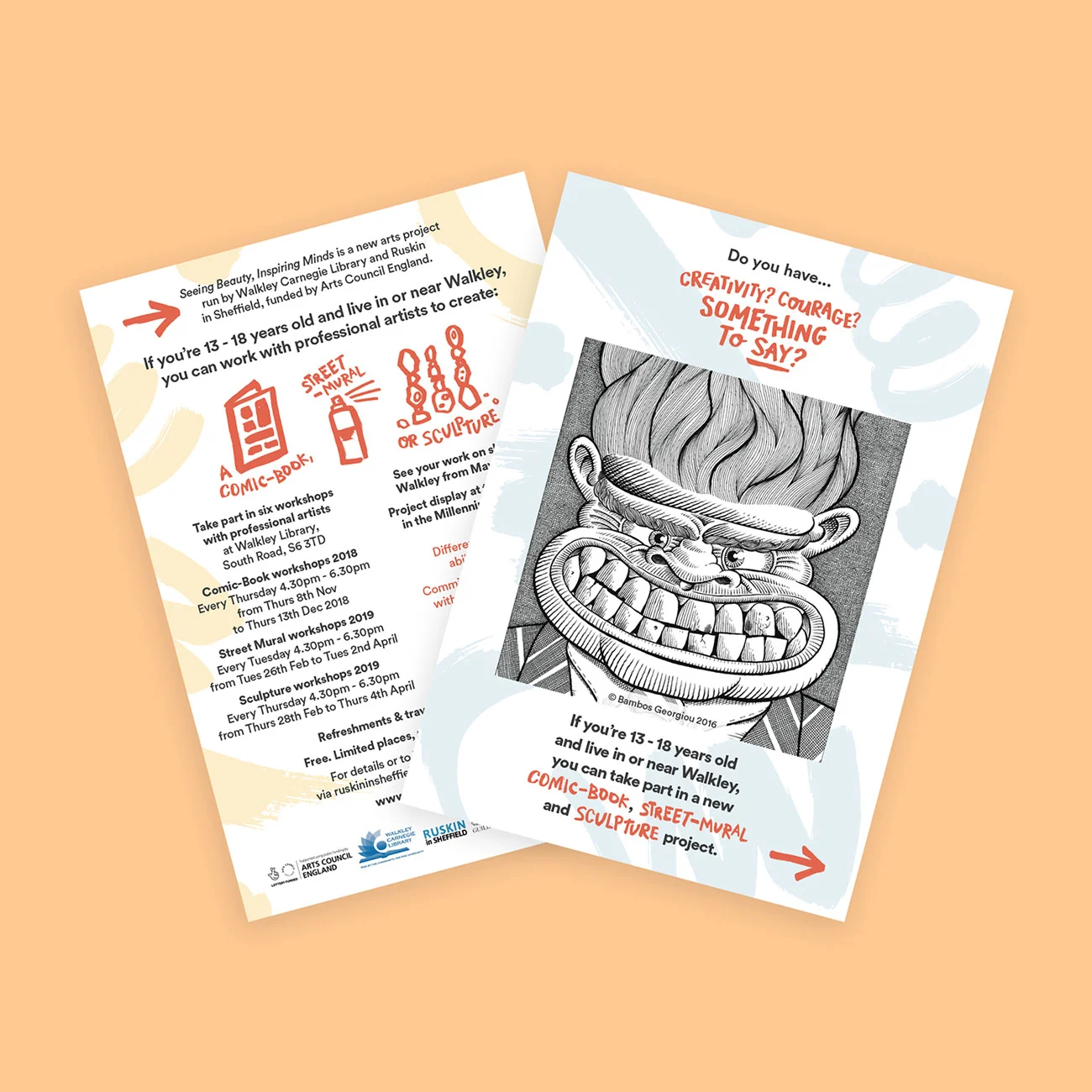 I designed and illustrated hand outs promoting the different events organised by Ruskin in Sheffield & The Guild of St. George.
